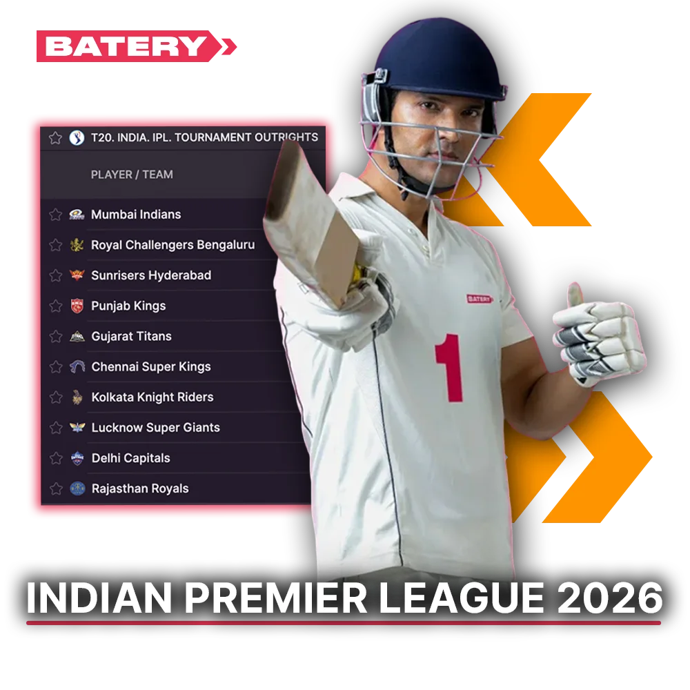 On BateryBet, you can bet on more than 5,500 events daily, including IPL 2026 matches. We provide one of the most competitive odds on the Indian market. By joining today, you can get 500% welcome bonus on 5 deposits up to 150,000 INR + 430 FB.